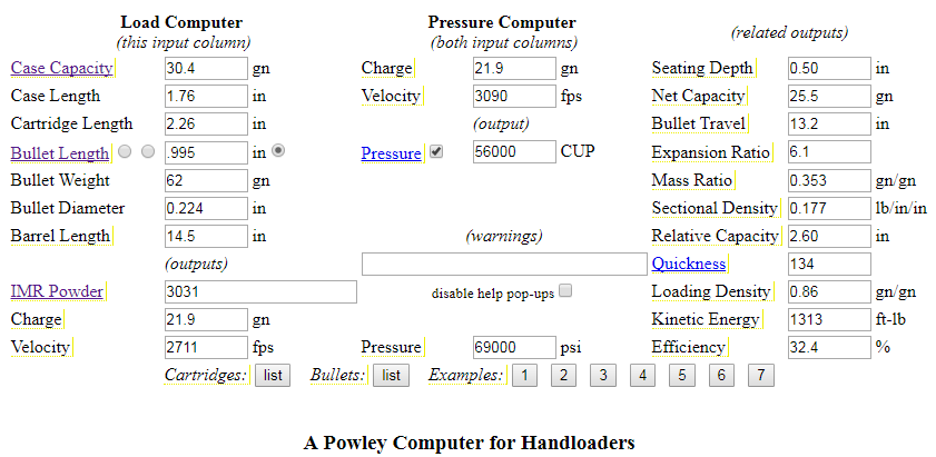 A couple other miscellaneous technical notes about the evaluation are worth sharing. The pressure limit I used for the Powley computer (56000 CUP) is based on results for M855A1 data when entered into the computer. That data is shown below, note the 56000 CUP figure needed to achieve M855A1’s muzzle velocity of 3,090 ft/s: