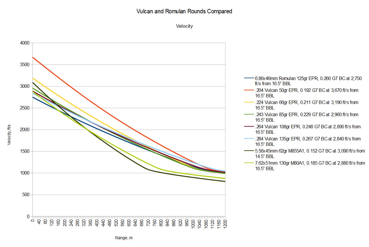 A few things are obvious from these graphs. The first is that the 6.86mm Romulan and .264 and .284 Vulcan rounds are all pretty big boy pants calibers. Both the 6.86mm and .264 start to exceed M80A1 for energy by just 200-300 meters, and the .284 Vulcan outright beats M80A1 for energy at all ranges. Also, the .224 Vulcan substantially out-performs M855A1 out to 700 meters due to its much lower drag bullet – after that distance M855A1 goes subsonic and is accordingly subject to far lower drag, allowing it to “catch up” somewhat with the still supersonic .224 Vulcan – although it never fully does. The .243 Vulcan, too, makes an impressive showing, beating M80A1 for energy out to 900 meters and remaining competitive out to 1,200 meters. Given how much lighter the .243 Vulcan is, this is really something. For drop at long ranges, the low drag bullets of all Vulcan rounds set them apart from both M855A1 and M80A1, but it’s the ultra-high-velocity .204 Vulcan that stands out the most here. That, coupled with the rather competitive drift characteristics we see for the round has me wondering whether a few years from now ultra high velocity .20 bores will be a staple of long range competition. It seems far-fetched now, but it follows the current trend: 6.5mm rounds like the 6.5mm Creedmoor and .260 Remington supplanted .30 caliber rounds like .308 Winchester and .300 Winchester Magnum, only to be supplanted themselves by 6mm derivatives like the 6mm Creedmoor and 6x47mm Lapua. It’s not so difficult to imagine those slick 6mms being replaced in turn by even more extreme .22 calibers rounds firing 90 grain VLDs, and the jump from that to .20 caliber is just one good low drag .20 cal VLD bullet away from possible. Yet, for military use, such extreme rounds really are too much of a good thing. It’s difficult to imagine such an overbore round giving the kind of barrel service life demanded of military weapons, so – even if such a thing comes to pass – it will probably remain in the competition world only.